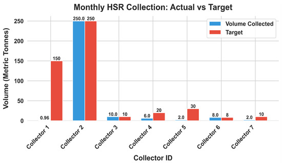 Figure 2 illustrates the actual versus target monthly HSR waste collection for each collector in the LRI, measured in metric tonnes. The data showed significant variations in both collection targets and performance across collectors. Collector 2 demonstrated optimal performance, achieving 100% of their substantial 250-metric tonnes target. Similarly, collectors 3 and 6 also reached 100% of their targets, collecting 10 and 8 metric tonnes, respectively. However, other collectors showed varying degrees of underperformance. Collector 4 achieved 30% of their target, collecting 6 out of 20 metric tonnes, while collector 7 met 20% of their goal, gathering 2 out of 10 metric tonnes. The most notable discrepancies were observed with collectors 1 and 5; collector 1 achieved only 0.64% of their target, collecting 0.96 metric tonnes against a substantial 150-metric tonnes goal, while collector 5 reached 6.67% of their target, gathering 2 out of 30 metric tonnes. These disparities highlighted the challenges in setting and achieving collection targets across different areas or operational contexts within Lagos. The data suggests a need for reviewing and potentially adjusting targets, as well as investigating and addressing factors contributing to underperformance in some areas to enhance the overall effectiveness of the RP.