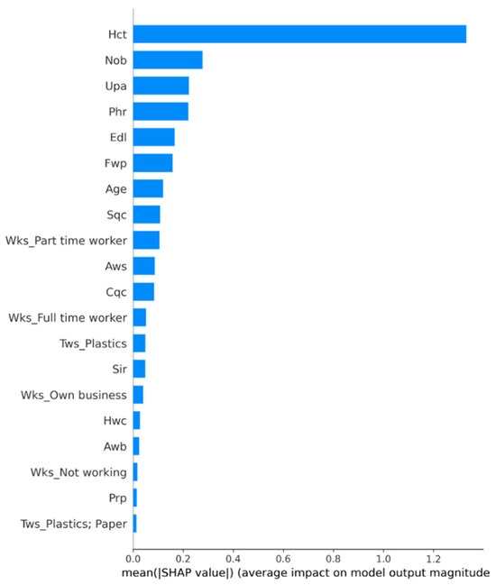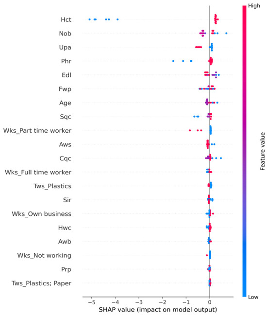 The SHAP analysis of the best-performing model, CatBoost + BO, provided valuable insights into the factors that most significantly influence household motivation to participate in the LRI. Figure 3 and Figure 4 illustrated the importance of the feature and its impact on the model’s predictions for the top 20 features, respectively. The Hct emerged as the most influential factor by a significant margin, suggesting that the regularity of waste collection services plays a crucial role in motivating households to participate in recycling programmes. The timely collection of waste is essential in the WM process [77]. Where there is an irregularity in the collection, bins tend to overflow and can result in the inappropriate segregation of recyclables at the source [78]. When this happens repeatedly, households may become demotivated to recycle over time. Following Hct, the next most important features are the Nob, Upa, and Phr. These factors underscore the importance of proper WM infrastructure, technology adoption, and household attitudes toward recycling in driving participation behaviour. Regarding the essence of WM infrastructure, one study [79] observed that the availability of waste segregation facilities tend to improve waste sorting, thereby improving the separate collection of recyclables. The visualisations also revealed that Edl, Fwp, and age had moderate impacts on recycling participation. Interestingly, the employment status, particularly part-time work (Wks_Part time worker), showed a notable influence, ranking higher than some service-related factors. Sqc, Aws, and Cqc showed relatively minor influences yet still contributed to the model’s predictions. It is pertinent to note that while the two dominant factors of Nob and Hct may be peculiar to the situation in Lagos under the LRI, some scholars in SSA have identified other significant factors such as household income, formal education, access to social grants, and age as motivators of recycling participation [80]. This implies that under diverse conditions and circumstances, people’s motivations for recycling might differ. As such, it is essential to understand the local situation when making policies aimed at improving recycling outcomes.