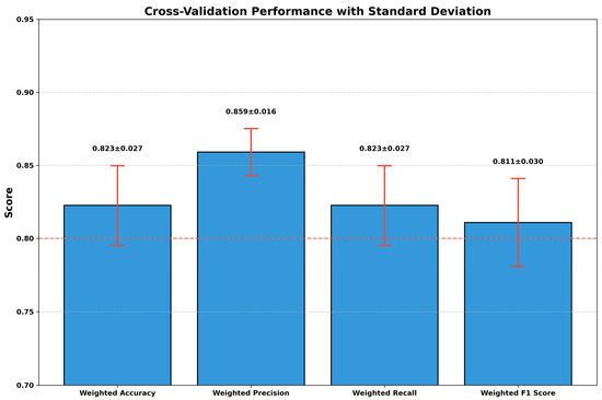 To validate the robustness of the CatBoost model and ensure that performance metrics were not artifacts of a particular data split, a k-fold cross-validation (k = 5) was implemented. Cross-validation provides a more comprehensive assessment of model performance by evaluating the model on multiple subsets of the data, thus mitigating the risk of overfitting and yielding more reliable performance estimates [88]. Figure 5 presents the cross-validation performance of the optimised CatBoost model across four key metrics: weighted accuracy, weighted precision, weighted recall, and weighted F1 score. Each bar represents the mean performance metric over five folds, with error bars indicating the standard deviation of each metric across folds. The cross-validation results demonstrate strong and consistent performance across all metrics, with weighted precision showing the highest value at 0.859 ± 0.016. Weighted accuracy and weighted recall both achieved identical mean scores of 0.823 ± 0.027, indicating balanced performance between correctly identifying positive and negative instances of recycling motivation. The weighted F1 score, which represents the harmonic mean of precision and recall, showed a solid performance of 0.811 ± 0.030. Importantly, the relatively small standard deviations (ranging from 0.016 to 0.030) across all metrics indicate high stability in model performance across different data partitions. This consistency is particularly important given the convenience sampling method used in data collection, as it suggests that the model’s predictive capacity is not overly sensitive to the specific subset of households included in the training or testing sets. The cross-validation results confirm and strengthen the findings from the initial model evaluation. The optimised CatBoost model demonstrates reliable performance in predicting household recycling motivation, with weighted precision consistently exceeding 85%. This high precision is particularly valuable in the context of recycling program management, as it indicates that the model is especially effective at correctly identifying households likely to participate in recycling initiatives, allowing for more targeted interventions and resource allocation. The robust cross-validation performance further validates the importance of the key features identified through SHAP analysis. The stability of model performance across different data subsets reinforces the conclusion that Hct and Nob are indeed critical factors influencing household recycling motivation in Lagos, and not merely artefacts of a particular data partition.