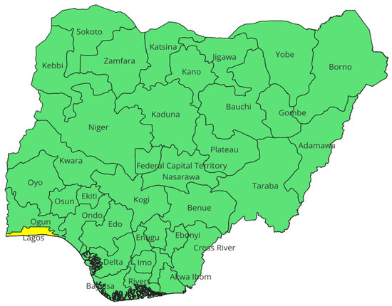 - LSBS. Abstract of Local Government Statistics. Available online: https://mepb.lagosstate.gov.ng/wp-content/uploads/sites/29/2017/01/Abstract-Of-Local-Government-Statistics-2016.Pdf (accessed on 11 September 2024).