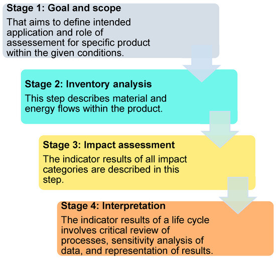 The study of LCA analysis of PCTW is tricky because the processes of textile production are complex, and the scope of available literature in this domain is not defined. So, data for textile production processes were taken from literature, LCA software was used, and professionals working in the field were consulted. The end-of-life is really an important aspect while measuring environmental impact because the quality of PCTW is directly related to its handling at its life span. An LCA study of cross culture utilization of textiles provides information about important parameters to achieve a better environmental impact from consumer handling of their garments, and washing and ironing cycles in different demographical locations [37]. In this prospect, an LCA study of the application of water repellent chemicals over the fabric surface is also considered helpful in reducing the environmental impact of garments because it helps to reduce the need for washing and gives long life to garments [38,39]. The nature of the fiber used to make textile products really matters in their environmental impact. The LCA studies of different fibers such as polyester, nylon, acrylic, cotton, and spandex have shown various environmental impacts related to fiber nature, and within these studies, textile products made from cotton fiber have shown greater environmental impacts [40]. The LCA studies on PCTW have much more to deliver, one important case is bio-recycling methods, but its calculation is a challenge; moreover, controlling the quality of the product is really difficult [41]. The stages of life cycle assessment are illustrated in Figure 1, which denotes clear steps of measuring environmental impacts by following LCA methodology.