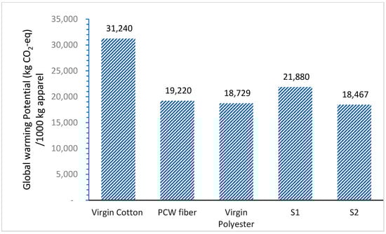 Environmental impact categories associated with cotton cultivation under conventional and organic agriculture differ slightly. The global warming potential (GWP) impact for conventional cotton is slightly higher (0.62–5.5 kg CO2 eq) than that reported for organic cotton (0.98–2.40 kg CO2 eq), most likely due to the differences in the use of human labor, tractors, and other farm machinery in every cotton crop. However, they can be considered similar taking into account the high variability within the same kind of cultivation [43]. LCI data for conventional cotton were obtained from various studies, as presented in Table 1. Scarce LCA data have been obtained from the literature regarding ginning operations, mainly due to the common inclusion of the ginning effects within the general framework of cotton cultivation. Thus, environmental impacts caused by the ginning process appear minimal when they are compared to those obtained for cotton cultivation. Moreover, the operations of ginning and fiber transportation to apparel production units are considered in the environmental impact calculations for the cultivation of virgin cotton. The most prominent environmental impact caused by cotton cultivation is its potential for climate change or global warming (31240 kg CO2 eq), which is higher than that of PCTW fiber, polyester, and the two designed scenarios. During fiber recycling, the collection, cutting, and shredding are integral steps in the extraction of raw materials. The global warming potential of PCTW fiber at the raw fiber stage is 3817 kg CO2 eq, whereas for cotton, the value at the raw fiber stage is 14,459 kg CO2 eq. The climate change potential of polyester fiber at this stage is 806 kg CO2 eq. In this stage, transportation of raw materials is also included, but the major contributor to environmental impact is resource consumption.
