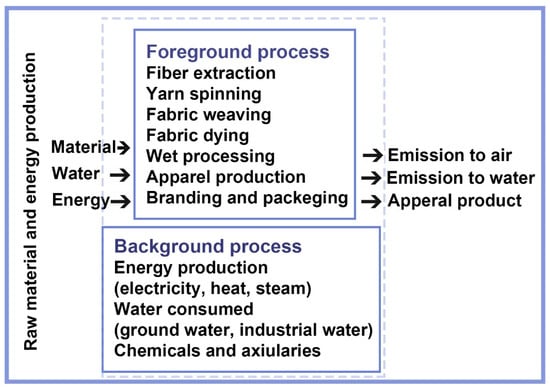 This LCA study is based on a “cradle-to-gate” approach for product life to calculate the environmental impacts. Therefore, system boundaries are defined by considering all the production processes for apparel production. LCA is done by defining product systems that describe the key elements of physical systems and unit processes to be included in the system, as given in Figure 4.