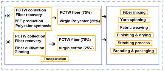 The textile production chain is a complex network of different production processes that starts from the extraction of fibers, which is followed by yarn spinning, weaving, dying, finishing, stitching, etc. To reduce environmental impact, the apparel production by using PCTW fibers involves different fiber extraction processes, which are divided into different phases. Steps for apparel production for virgin cotton, polyester fiber, and PCTW fibers are given in Figure 3.