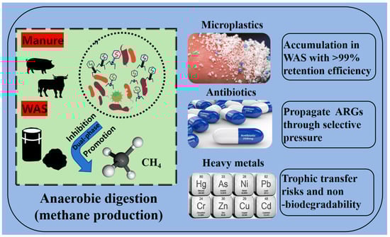 Notably, MPs act as vectors for adsorbing antibiotics and metal ions, creating compounded toxicity that disrupts methanogenic pathways [15,16]. Current knowledge gaps persist regarding the fate of microplastics (MPs), antibiotics, and heavy metals (HMs) in anaerobic digestion (AD), particularly the fragmentation pathways of biodegradable MPs, dissemination mechanisms of antibiotic resistance genes, and synergistic microbial inhibition by metal–organic complexes. This review critically examines their sources, transformation behaviors, and toxicity risks to methanogenesis and microbial consortia. Advanced remediation strategies such as biochar adsorption, microbial augmentation, and bioreactors are proposed to enable safer organic waste valorization via multi-level synergies.