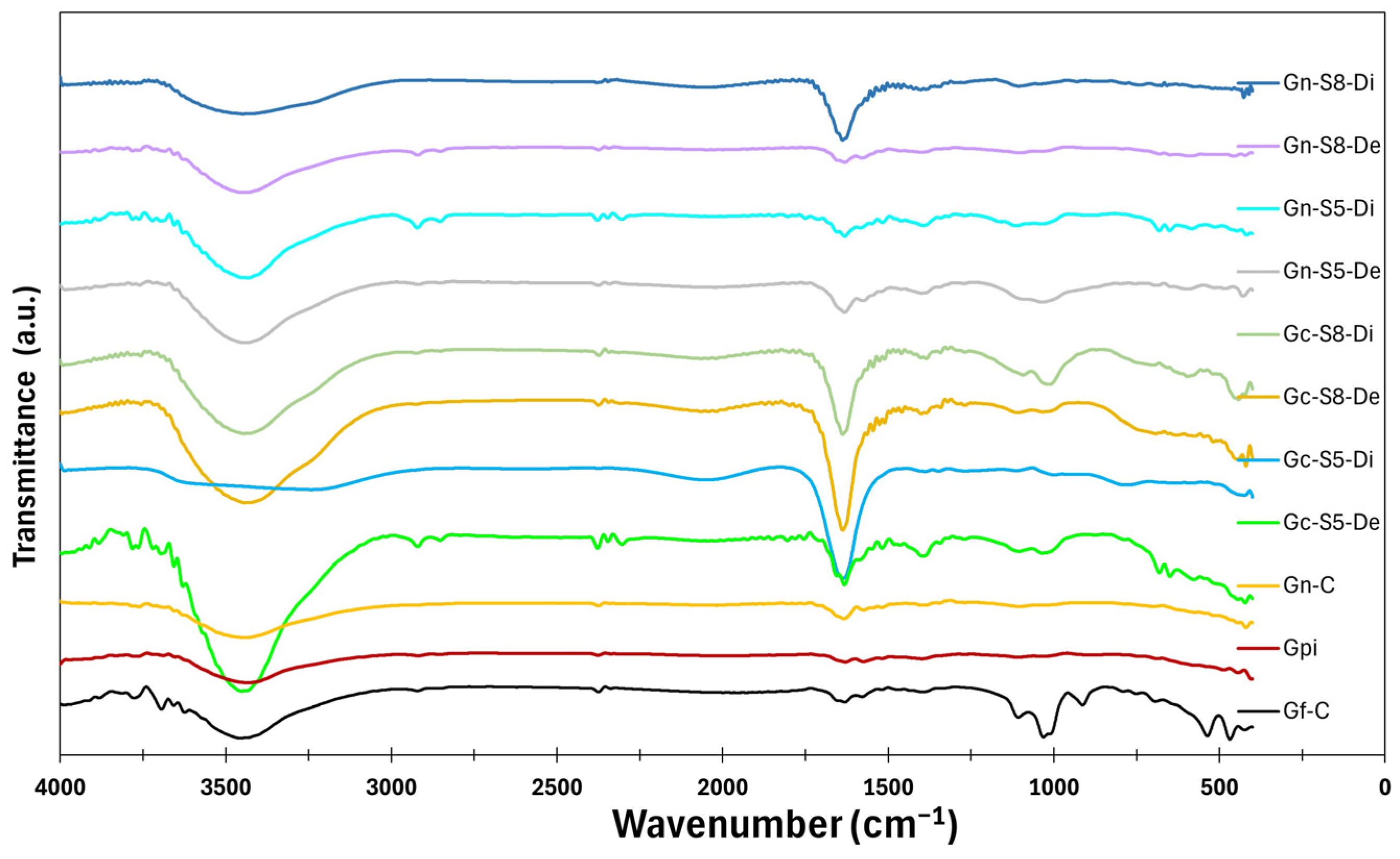 −1, is associated with the stretching of hydroxyl (-OH) groups and adsorbed water. This band appears more intense in materials derived from commercial graphite (Gf-C, Gpi, Gc-S5-De, and Gc-S8-De) compared to those obtained from LIB-recovered graphite (Gn-S5-Di, Gn-S8-Di, and Di), suggesting that the commercial material has a greater tendency to retain these functional groups after the applied treatments. Additionally, the suspended fraction in sonicated materials exhibits greater intensity in this region than the decanted fraction, which may be attributed to a higher specific surface area and a greater dispersion of oxygen-containing groups in this fraction.