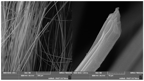 SEM image of viscose fiber at 200× (left) and 5000× (right) magnification.