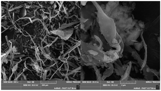 SEM image of recycled cellulose fiber particles at 200× (left) and 20,000× (right) magnification.