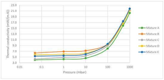 As mentioned above, the thermal conductivity was also determined as a function of temperature at pressures of 0.05 mbar and 1000 mbar (atmospheric pressure). The results are presented as graphs in Figure 7 and Figure 8.