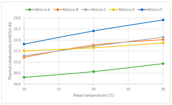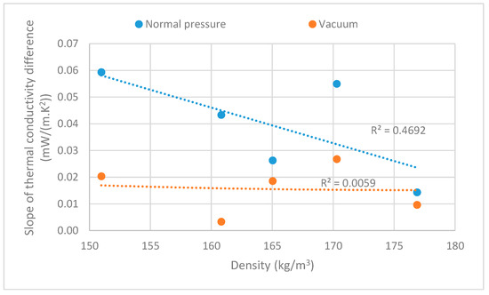 Furthermore, the measured dependences of the thermal conductivity of test samples on temperature (for a temperature difference of 10 °C) under a vacuum and at normal pressure were evaluated, and a correlation was found between the direction of the change in thermal conductivity as a function of temperature and bulk density for measurements under normal pressure; see Figure 9. For measurement under a vacuum, no significant dependence was found.