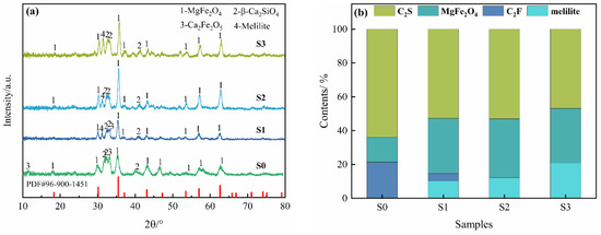 Figure 1a,b show the XRD results and Rietveld refinement analysis of the oxidation slags with different copper slag additions at an oxidation temperature of 1450 °C and an oxidation time of 10 min. As shown in Figure 1a, the diffraction peaks of the oxidation slags (phase 1) and MgFe2O4 in PDF#96-900-1451 correspond well in terms of the diffraction angle and height, suggesting that MgFe2O4 is formed. It can be observed that Ca2Fe2O5 is exclusively present in the S0 sample, where no copper slag is added. Furthermore, the RO phase in the BOF slag disappears after the oxidation process, indicating that the FeO in the RO phase can be oxidized to Fe2O3 and forms MgFe2O4 in situ under an oxidizing atmosphere, as shown in Equation (1). The addition of copper slag resulted in a significant enhancement in the diffraction peak intensity of MgFe2O4 in the S1–S3 samples in comparison to the S0 sample. Furthermore, the diffraction peak intensity of Ca2Fe2O5 in BOF slag and Fe2SiO4 in copper slag underwent complete disappearance. The synergistic modification between the two slags via the reactions shown in Equation (2) was found to promote the release of simple iron oxides from the complex iron-containing mineral phases in the two slags, thereby enhancing the activity of the iron oxides and facilitating the formation of MgFe2O4, as shown in Equation (3). In addition, the XRD patterns of the S1–S3 samples show no diffraction peaks for free CaO and free MgO in BOF slag. The results indicate that the synergistic oxidation of BOF slag and copper slag is favorable for MgFe2O4 formation and BOF slag stabilization [24,25].