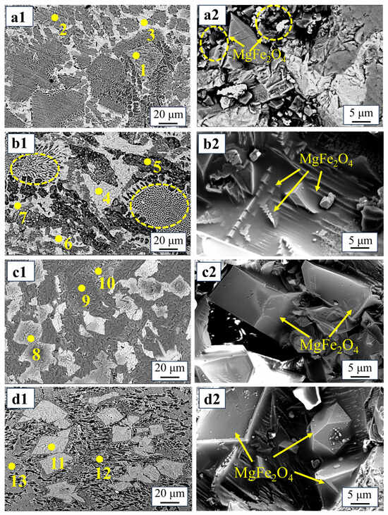 Figure 1b shows the results of the Rietveld refinement analysis of the XRD patterns [26,27], which demonstrates that the greatest MgFe2O4 content of 32.82% is achieved with the addition of 10% copper slag. However, when 15% copper slag is added, the content of melilite (Ca2MgSi2O7 and Ca2Al2SiO7) gradually increases, while the content of MgFe2O4 decreases, which is not conducive to MgFe2O4 formation. Figure 2 and Table 1 show the SEM-EDS analysis of the oxidation slags. As shown in Figure 2(a1,a2), the iron-containing phases in the S0 sample are MgFe2O4 and Ca2Fe2O5, and a large number of small-faced MgFe2O4 crystals form clusters of crystals. Furthermore, Figure 2(b1,b2) show that the MgFe2O4 in the S1 sample can be mainly divided into two different morphologies, namely honeycomb and clusters [28], and Ca2SiO4 and Ca2Fe2O5 are closely dispersed around MgFe2O4, preventing magnetic phase separation. As shown in Figure 2(c1,c2,d1,d2), with an increase in copper slag addition, the Ca2Fe2O5 phase disappears, and many small MgFe2O4 crystals gradually grow and aggregate into large polygonal crystals, with particles sizes of nearly 60 µm, indicating that the addition of copper slag obviously promotes the agglomeration and growth of MgFe2O4 [29]. However, the amount of melilite increases with the addition of 15% copper slag, as shown in Table 1. Melilite not only contains little Fe, but it also results in a decrease in Mg involved in the reaction, which is not conducive to the formation of MgFe2O4.