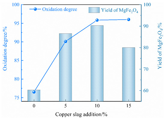 Effects of copper slag addition on the oxidation degree of Fe2+ and the yield of magnetic MgFe2O4.