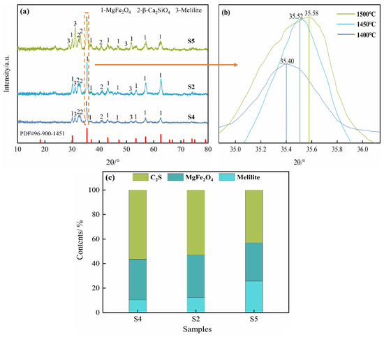 Furthermore, together with the Rietveld refinement analysis, as shown in Figure 4c, it is found that the greatest content of MgFe2O4 is 34.91% at 1450 °C. Figure 4b depicts an enlarged version of the dotted line area in Figure 4a. According to Bragg′s law [32], the relationship between the diffraction angle and interplanar spacing is as shown in Equation (6):
