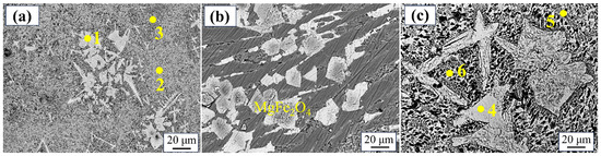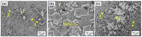 The microstructures of the oxidation slags at temperatures ranging from 1400 to 1500 °C are shown in Figure 5, while Table 2 shows the atomic percentages of the relevant spectral spots. The yield of MgFe2O4 obtained through magnetic separation is closely related to its particle size. As shown in Figure 5a, the magnetic phases develop into tiny dendritic crystals along the direction of the nucleus. The size of the MgFe2O4 particles increases with the temperature, reaching a maximum of 60 µm, suggesting that a higher temperature can promote the formation and growth of MgFe2O4. Table 2 shows that the MgFe2O4 phase contains more Al at 1500 °C, indicating that higher temperatures can replace Fe3+ with Al3+. Therefore, an overly high oxidation temperature will inhibit the synthesis of MgFe2O4.