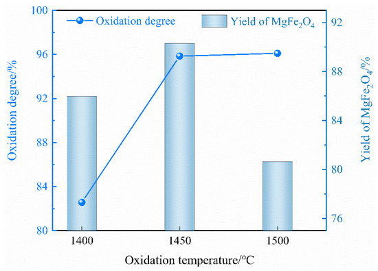 As shown in Figure 6, the influence of different oxidation temperatures on the oxidation degree of Fe2+ and the yield of MgFe2O4 is evident. It is observed that, with an increase in the oxidation temperature from 1400 to 1500 °C, there is a corresponding rise in the oxidation degree from 82.58% to 96.10%. This phenomenon can be attributed to the enhanced molecular diffusion rate at higher temperatures. An increase in the oxidation temperature can improve the kinetic conditions of the oxidation reaction and increase the mass transfer rate of iron ions (Fe2+ and Fe3+) and O2− in the slag, which is not only beneficial for the increase in the particle size of MgFe2O4, but also improves the yield of the magnetic phase in the magnetic separation process. Conversely, the yield of MgFe2O4 exhibits an initial increase, followed by a subsequent decrease, reaching a maximum value of 90.31% at an oxidation temperature of 1450 °C.