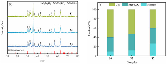 Figure 7a,b show the XRD results and Rietveld refinement analysis, respectively, after different oxidation times, with 10% copper slag addition and an oxidation temperature of 1450 °C. The diffraction peak intensity and the content of β-Ca2SiO4 and MgFe2O4 are basically consistent, but those of melilite gradually increase.
