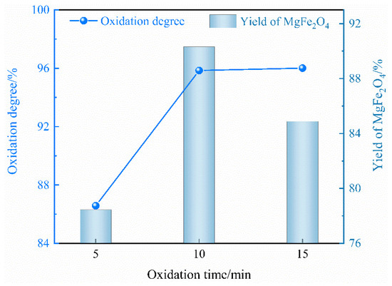 Figure 9 illustrates the impact of different oxidation times on the oxidation degree of Fe2+ and the yield of MgFe2O4. The oxidation degree increases significantly with increasing oxidation times from 5 to 10 min. Nevertheless, when the oxidation time is extended to 15 min, the oxidation degree demonstrates a gradual upward trend, suggesting that the majority of the Fe2+ in the oxidation slags has been oxidized to Fe3+. Additionally, the yield of MgFe2O4 attained its maximum at 10 min, substantiating the recommendation of an oxidation time of 10 min.