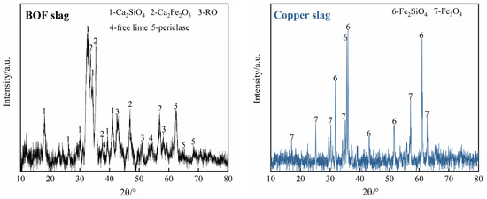XRD analysis was used with an X-ray diffractometer (X′pert PRO, PANalytical, Netherlands) to determine the phase compositions of the BOF slag and copper slag with Cu Kα radiation (40 kV, 40 mA, wavelength 0.154 nm), and the scanned angular range varied from 10° to 80° with a scanning speed of 0.2°/s. The XRD patterns of the two slags are presented in Figure 11. The main phases of BOF slag are dicalcium silicate (Ca2SiO4), dicalcium ferrite (Ca2Fe2O5), the RO phase, free lime and periclase, while copper slag consists of fayalite (Fe2SiO4) and magnetite (Fe3O4). Moreover, the content of f-CaO and f-MgO in the BOF slag were detected by chemical extraction according to the GB/T 176-2017 national standard and the studies of Uehara et al. and Hanada et al., respectively [35,36,37].