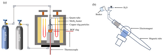 The oxidation experiment was carried out in a high-temperature furnace (Shanghai Jujing Precision Instrument Manufacturing Co., Ltd., Shanghai, China), as shown in Figure 12a, while Figure 12b depicts the wet magnetic separator (XCGS-50, Beijing Grand BoYu Technology Co., Ltd., Beijing, China), with a maximum magnetic flux density of 300 mT. Here, 30 g BOF slag was placed in a corundum crucible, which was placed into the constant-temperature zone of the tube furnace. The BOF slag was heated to the target temperature (1400 °C, 1450 °C and 1500 °C) to simulate the molten state of BOF slag during discharge under a high-purity argon atmosphere and held for 10 min to uniformize the slag. Then, crushed copper slag particles with granularity of less than 74 µm and oxygen gas were simultaneously injected into the molten BOF slag through the hanging corundum tube (OD 8 mm, ID 6 mm), and the flow rate of the oxygen gas was 1 L/min. The range of copper slag addition was selected as 5% to 15%. When the oxidation time (5 min, 10 min and 15 min) was reached, the crucible was taken out and cooled in air at room temperature to obtain oxidation samples. The oxidation experiment’s conditions are shown in Table 7.