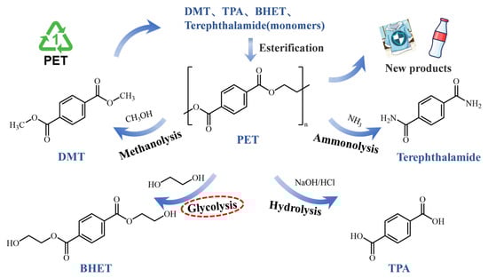 Chemical recovery involves the depolymerization of PET under the influence of chemical reagents, producing oligomers, intermediates, or monomers, such as terephthalic acid (TPA), dimethyl terephthalate (DMT), bis(2-hydroxyethyl) terephthalate (BHET), and ethylene glycol (EG), and further transforming it into value-added products [9,10]. Documented chemical recycling processes for waste PET typically include ammonolysis [11], hydrolysis [12], glycolysis [13], and methanolysis [14], as illustrated in Figure 1. However, challenges, such as high costs, energy consumption, and contamination during chemical recycling, persist, highlighting the need for further innovation and investment in sustainable recycling technologies.