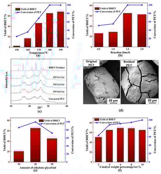 Next, the effect of EG volume on PET glycolysis at 180 °C was examined, and the results are shown in Figure 4d. When 10 mL EG was used, PET conversion decreased to 85.90% due to insufficient reactant supply. The BHET yield was especially low under these conditions, as a larger proportion of oligomers formed through the re-polymerization of BHET monomers or incomplete depolymerization of PET. At 30 mL EG, a decrease in catalyst concentration resulted in lower glycolysis activity, and both PET conversion and BHET yield exhibited a general decline. These results highlight the critical role of EG volume in PET glycolysis. The molar ratio of EG to catalyst should be precisely controlled to achieve complete PET conversion and high BHET selectivity. Furthermore, the effect of catalyst weight percentage was also explored (Figure 4f). Complete degradation of PET could not be achieved at a lower catalyst percentage than 10 wt.% within 1.5 h, although higher BHET selectivity was obtained. This may be attributed to the possibility that the lower catalyst percentage caused a decrease in the alkalinity of the solution such that the glycolysis rate was relatively low. Meanwhile, the conversion balance between BHET monomer and oligomer, as well as the alkaline hydrolysis of BHET, would be affected by the increasing alkalinity of the solution. In consideration of complete conversion of PET, 10 wt.% BPA was selected as the best amount of catalyst. Based on these findings, 180 °C, 1.5 h, 2 g PET, 0.2 g BPA, and a ratio of mBPA to vEG = 0.01 were identified as optimal conditions for subsequent exploratory experiments.