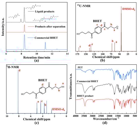 Product distribution for the optimal experiment is shown in Figure 5a. Three main product peaks were identified in the unseparated liquid products, with retention time (RT) corresponding to mono(2-hydroxyethyl) terephthalate (MHET, 7.933 min, Figure S3), BHET (8.373 min), and acidic substances (11.320 min), confirmed through High-performance liquid chromatography–electrospray ionization–quadrupole time of flight/mass spectrometry (HPLC-ESI-QTOF/MS) analysis. After condensation–crystallization, only a single chromatographic peak (RT = 8.373 min) appeared, indicating the successful separation of BHET from the mixture (Figure S4). Compared to the HPLC chromatogram of commercial BHET, no oligomers were detected in the separated BHET. To further confirm the purity of the BHET product and eliminate the matrix effect, additional characterizations were performed. The 13C-NMR (Figure 5b), 1H-NMR (Figure 5c), and FTIR (Figure 5d) spectra of the BHET product were consistent with the standard BHET. Therefore, the retention time of 8.373 min in the HPLC chromatogram confirmed that the product was BHET with a high purity level. The XRD spectrum (Figure S5) of the BHET product displayed sharper and narrower diffraction peaks compared to PET, indicating that the crystallinity of the product had increased, which was indicative of successful depolymerization. Although the BHET yield of BPAS was lower than that of other heavy metal catalysts [45] or co-solvents [24], the use of waste and green reagents in this system allowed for depolymerization performance comparable to Zn(OAc)2, demonstrating the potential for a more environmentally friendly approach to PET glycolysis.