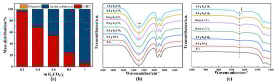 (a) Product distribution of catalytic glycolysis of PET using different amounts of K2CO3. FTIR spectrum of different concentrations of EG-K2CO3 solution: (b) 4000–2500 cm−1; (c) 2000–1400 cm−1. General reaction conditions: 2 g PET, EG-K2CO3 solution, 180 °C, 2 h. EG-K2CO3 solution was obtained through heating at 180 °C for 0.5 h. The direction of the arrow indicated the trend of peak shift and intensity change.