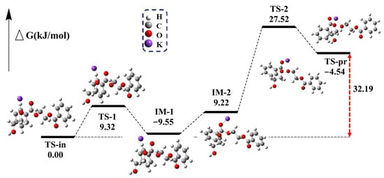 Due to the strong electronegativity of both the carbonyl oxygen and the ethylene glycol oxygen, electron-deficient potassium ions are attracted to these atoms. This interaction causes the potassium ion to move between the carbonyl oxygen and the ethylene glycol oxygen, stabilizing the charge distribution during the addition reaction. A similar interaction mechanism occurs during the departure of the remaining PET chains, leading to the formation of IM-2. As HOCH2CH2O− attaches to the carbonyl carbon, the remaining PET chains begin to depart. The distance between the carbonyl carbon and the PET ester oxygen changes from 1.49 Å to 2.16 Å, indicating a tendency for the bond to break at the transition state TS-2. Finally, the remaining PET is completely removed in the form of potassium alkoxide, and the Gibbs free energy for the entire process is calculated to be 32.19 kJ/mol.