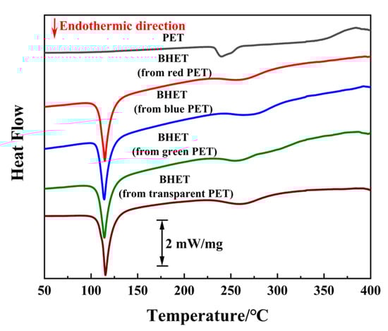 To verify the feasibility of this reaction system for real PET products, several colored waste beverage bottles with a thickness of 0.11 mm were selected as experimental materials. These bottles were cleaned, labels were removed, and they were cut into 5 mm × 5 mm pieces under the optimal reaction conditions. The conversion and BHET yield for each waste PET product are shown in Table 3. Despite the less efficient mass transfer process for PET flakes compared to PET particles, complete conversion was achieved within 3 h. A relatively high BHET yield was obtained, even with the interference of additives, such as dyes and other organic impurities. Differential scanning calorimetry (DSC) was used to further assess the purity of the BHET product derived from various colored PET bottles, as shown in Figure 9. The high purity of BHET, which is free from contaminants, such as MHET, oligomers, or additives inherent in waste PET, was confirmed by a single peak at approximately 105 °C in the DSC profiles [49]. Notably, the BHET product obtained through condensation–crystallization was noticeably less colored compared to the initial waste PET flakes. This indicates that the BPA-EG system is tolerant of colored waste PET and can extract and decolorize dyes in PET.