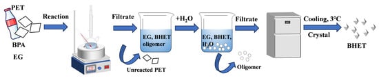 In a typical procedure (Scheme 1), 0.2 g BPA catalyst was dissolved in a round-bottom flask containing 20 mL EG, and the mixture was preheated to the specified temperature using an oil bath. Next, 2 g PET powder was added to the solution to initiate the glycolysis reaction at 180 °C under magnetic stirring at 300 rpm. Once the reaction was complete, the round-bottom flask was rapidly cooled in an ice-water bath. After cooling, the unreacted PET was separated through filtration using a sand core funnel and washed with deionized water. The unreacted PET was then dried in the oven at 60 °C for 24 h, and PET conversion was calculated using Equation (1). Subsequently, 50 mL hot deionized water was added to the filtrate to dissolve the BHET, and the mixture was allowed to cool to room temperature. The insoluble oligomers were separated from the BHET that was soluble in water via filtration. The filtrate containing BHET was then cooled in a refrigerator at 3 °C for 24 h to allow the BHET to crystallize completely. The crystallized BHET was filtered, transferred to a beaker, and dried in an oven at 60 °C for 6 h.