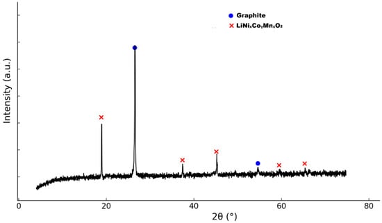The XRD pattern of the sample is presented in Figure 1. It reveals characteristic peaks corresponding to the hexagonal crystal structure, typical of layered lithium nickel–cobalt–manganese oxide at 18.7°, 36.5°, 44.6°, 58.3°, and 69.2°, that correspond to the LiNixCoγMnxO2 phase. The most intense peak at approximately 26.5° 2θ is attributed to the (002) plane of graphite.