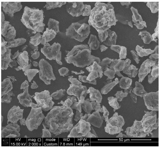 An SEM image of the cathode material powder (Figure 2) shows irregularly shaped secondary particles with sizes ranging from approximately 1 to 15 µm, consistent with the morphology typically observed for NMC-type layered oxide powders manually separated from aluminum current collectors. The particle structure suggests the partial fragmentation of the cathode layer during mechanical separation, which is typical for materials recovered from spent lithium-ion batteries.
