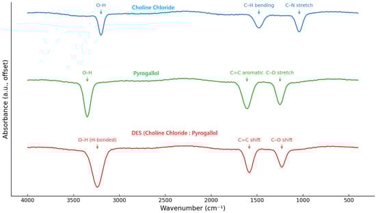 FTIR spectroscopy was used to confirm the formation of hydrogen bonding interactions between choline chloride and pyrogallol (Figure 3). In the DES spectrum, the broad O–H stretching band (3200–3500 cm−1) was significantly broadened and shifted compared to the spectra of the individual components, indicating extensive hydrogen bonding. The C–O and aromatic C=C stretching vibrations also showed minor shifts, suggesting an interaction between the phenolic groups of pyrogallol and the chloride ion of choline chloride. The apparent suppression of C–H bending and C–N stretching vibrations in the DES spectrum can be explained by strong hydrogen bonding between choline chloride and pyrogallol. Such interactions cause a significant broadening and overlap of vibrational bands, particularly in the O–H stretching and bending regions, which may mask or redistribute the C–H and C–N signals.