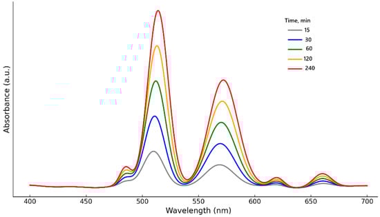 All spectra show two dominant peaks with maxima in the range of 510–515 nm and 568–573 nm, corresponding to d–d transitions in Co2+ ions complexed with the phenolic groups of pyrogallol. The increase in the intensity of these bands with increasing time indicates a progressive reduction of Co3+ to Co2+ and subsequent stabilization in the solution in the form of phenolate complexes. Additionally, weak absorption bands were recorded in the region of 485 nm (a possible contribution of Ni2+), as well as in the region of 620 and 660 nm, which may be associated with the formation of weak Mn2+ complexes and/or colloidal particles. The background line of the spectra has a characteristic wavy shape, which is due to internal electron transitions in pyrogallol and its interaction with metal centers. Shifts in absorption maxima by 2–3 nm with increasing time may indicate a gradual restructuring of the coordination environment, for example, from monodentate to chelate structures.