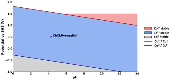 A Pourbaix diagram for cobalt with the working point of ChCl/pyrogallol DES (pH ≈ 4.3, E ≈ +0.5 V) marked by a black cross.