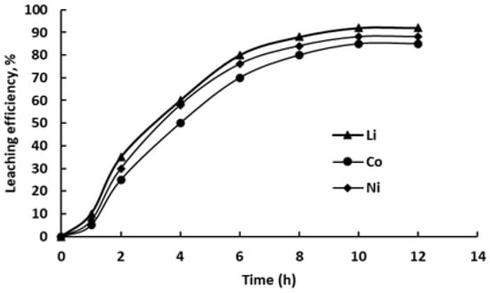 All three metals show rapid extraction in the first 4–6 h. Li leaching is the fastest, reaching 60% after 4 h and 80% by 6 h. Co and Ni follow a similar trend, with Co reaching 50% and Ni 58% at 4 h. Between 6 and 8 h, the extraction rate slows down, approaching a plateau: at 8 h, Li reaches 88%, Co 80%, and Ni 84%. Further leaching up to 12 h results in only minor improvements, with maximum extraction values of 92% for Li, 85% for Co, and 88% for Ni.