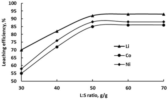 An increase in the L:S ratio from 30 to 50 g/g significantly enhances metal recovery, with extraction improving from 70% to 92% for Li, from 55% to 85% for Co, and from 58% to 88% for Ni. Further increases beyond L:S = 50 yield only marginal improvements, with all three metals reaching a plateau. These results indicate that an L:S ratio of 50 is optimal for efficient metal extraction under the studied conditions.