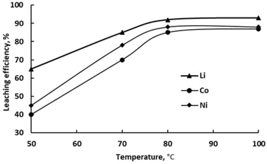 The next series of experiments was devoted to the study of the quantitative extraction of Li, Co and Ni into solution. Due to the low economic value of Mn and its low leaching efficiency under the studied conditions, manganese was not considered a priority element in the scope of this work.