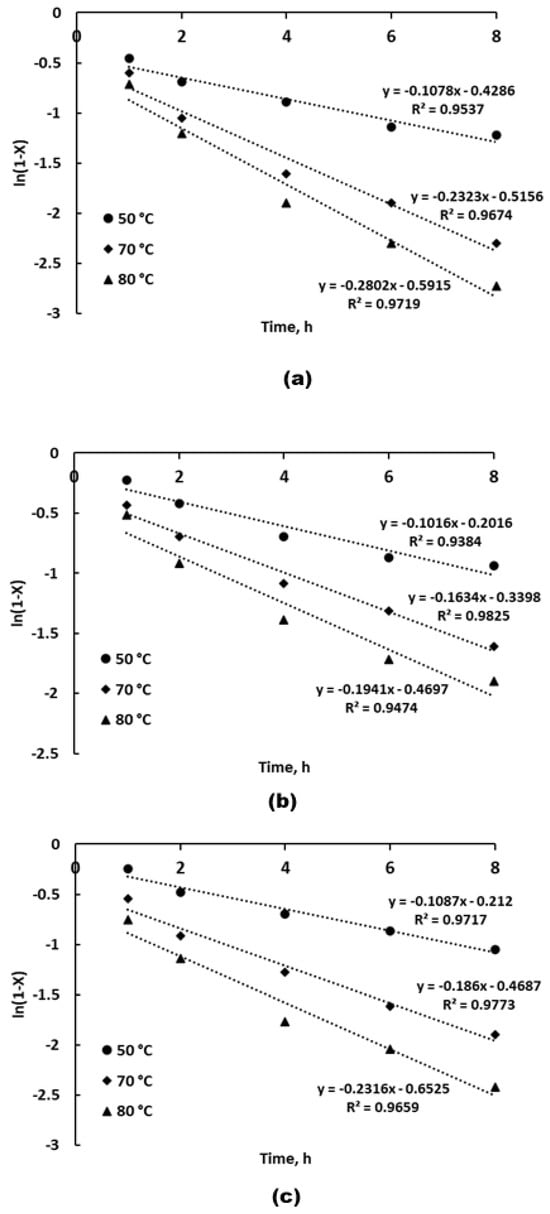 By plotting versus , a straight line is obtained, and the slope of this line corresponds to the rate constant kk. This method was applied to the leaching data at 50, 70, and 80 °C for each metal. The calculated kk values were then used in the Arrhenius equation to determine the activation energies.