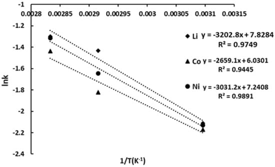 Among the three metals, Li exhibits the highest rate constants at all temperatures, reaching 0.302 h−1 at 80 °C, followed by Ni and Co. This trend suggests that Li is the most readily leached element, likely due to its position in the layered oxide structure and its high mobility. Cobalt shows the lowest leaching rates, which may be attributed to its initial oxidation state (Co3+) and the need for reduction prior to dissolution. The high R2 values (0.938–0.983) for all regressions confirm the applicability of the pseudo-first-order model to describe the leaching kinetics of all three metals under the studied conditions.