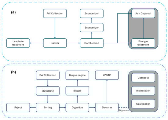 Anaerobic digestion (AD) is increasingly recognized as a sustainable method for managing food waste (FW) due to its ability to convert organic waste into renewable energy while recovering valuable nutrients. Compared to incineration, AD offers higher energy yields (1–2 times more), requires less land than landfilling, and results in lower acidification and eutrophication impacts than composting []. The biogas generated through AD can be used for electricity and heat or upgraded to biomethane for transport fuel [,]. Post-digestion, the residual digestate contains both degradable organics and essential nutrients such as nitrogen, phosphorus, and potassium, making it suitable for further treatment or valorization.