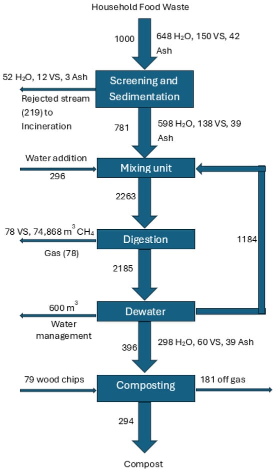 This study follows the ISO 14040/44 framework [], ensuring methodological consistency. A cradle-to-gate approach is applied, where all upstream environmental impacts of food waste management, including collection, transport, treatment, and energy recovery, are considered. The objective of the LCAwas to evaluate the environmental impacts of three AD scenarios with varying digestate treatments for managing FW from Irish households. The study aimed to identify a waste management system with reduced environmental impact for use by governmental organizations. The functional unit (FU) was defined as the treatment of 1000 tons of daily food waste generated by households. A functional unit of ‘1 ton of food waste treated’ is selected to allow direct comparisons across treatment options. The system included all processes from waste collection to the final disposal of solid residues. Four waste conversion scenarios were assessed: Incineration (Inci), AD followed by digestate composting (AD-compost), AD followed by digestate incineration (AD-incineration), and AD followed by digestate gasification (AD-gas). This study follows the ISO 14040/44 LCA framework [] and applies the CML-IA baseline method (2001) for impact assessment, covering global warming potential (GWP), acidification, eutrophication, abiotic depletion, and ecotoxicity. The system boundary includes direct emissions from waste treatment, energy substitution effects, and nutrient recovery benefits, with a 1% cut-off criterion for minor waste fractions. Environmental burdens on multi-output processes are allocated using the system expansion approach, replacing equivalent products in the economy (e.g., compost replacing synthetic fertilizers). For energy-producing processes, allocation is based on lower heating values (LHV) of energy carriers to ensure equivalency. To enhance comparability, impact categories are normalized using ILCD 2018 factors, and a weighted impact assessment (ReCiPe H 2016) prioritizes climate change, resource depletion, and toxicity.