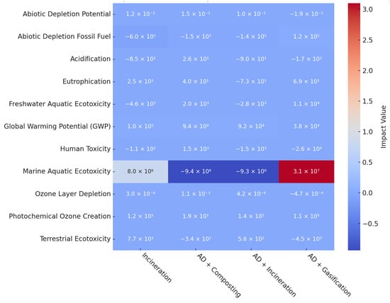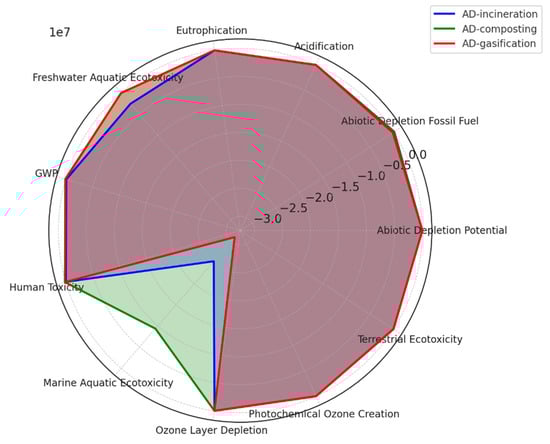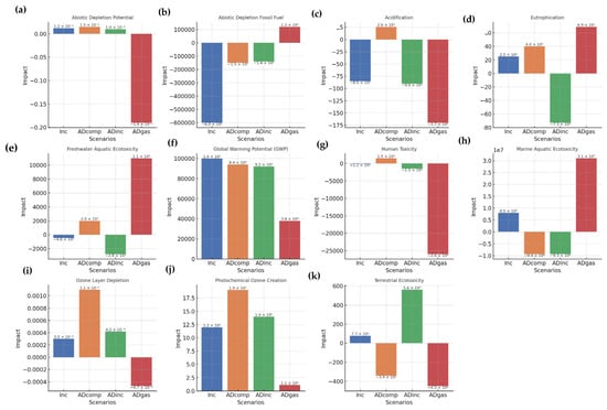 Finally, to understand the effect of varying impurity levels on the performance of the AD-incineration scenario, a sensitivity analysis was conducted by assessing two impurity scenarios: 5% and 10% contamination. The analysis aimed to understand how different impurity levels could influence the efficiency of the AD process across various environmental impact categories. The categories assessed included abiotic depletion potential, abiotic depletion of fossil fuels, acidification, eutrophication, freshwater aquatic ecotoxicity, global warming potential (GWP), human toxicity, marine aquatic ecotoxicity, ozone layer depletion, photochemical ozone creation, and terrestrial ecotoxicity.