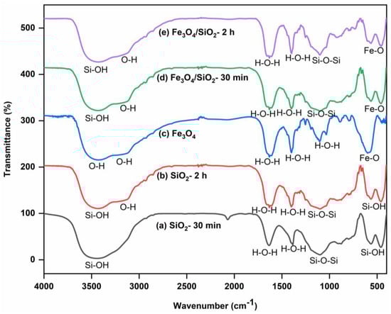 FTIR spectra of SiO2 NPs, Fe3O4 NPs, and Fe3O4/SiO2 nanocomposites: (a) SiO2—30 min, (b) SiO2—2 h, (c) Fe3O4 NPs, (d) Fe3O4/SiO2—30 min, and (e) Fe3O4/SiO2—2 h.