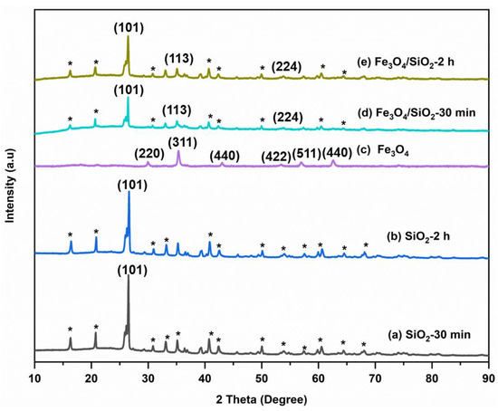 XRD patterns for SiO2 NPs, Fe3O4 NPs, and Fe3O4/SiO2 nanocomposites: (a) SiO2—30 min, (b) SiO2—2 h, (c) Fe3O4 NPs, (d) Fe3O4/SiO2—30 min, and (e) Fe3O4/SiO2—2 h. The asterisks (*) represent peaks from the impurity components.