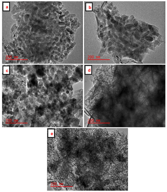 The particle size distribution and shape of the SiO2 NPs, Fe3O4 NPs, and Fe3O4/SiO2 nanocomposites were evaluated using TEM, as presented in Figure 5a–e. Figure 5a,b reveal uniform rod-like structures of SiO2 NPs, which are aggregated. The TEM image in Figure 5c displays spherical Fe3O4 NPs, which are distributed evenly and slightly agglomerated at other spots. The dark spherical nanoparticles embedded in thin rod-like structures are observed in Figure 5d,e. These spherically shaped nanoparticles in Figure 5d,e are associated with Fe3O4 NPs, while thin rod-like structures are amalgamated to SiO2 NPs, respectively. However, the embedded spherical nanoparticles are clustered in Figure 5d, whereas in Figure 5e, they are well-dispersed, implying that the number of active sites for adsorption would be high [58]. BET results emphasized this point as the highest surface areas of the SiO2 NPs and Fe3O4/SiO2 nanocomposites were found to be 10.5 and 67.7 m2/g (see Table 1). This is evident in that the surface area increased after the incorporation of Fe3O4 NPs into SiO2 NPs.