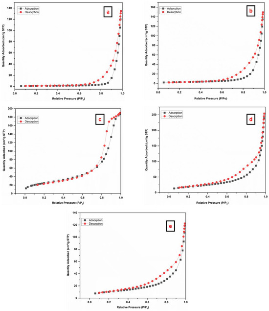 Nitrogen adsorption–desorption BET isotherms of the prepared materials (a) SiO2—30 min, (b) SiO2—2 h, (c) Fe3O4 NPs, (d) Fe3O4/SiO2—30 min, and (e) Fe3O4/SiO2—2 h.