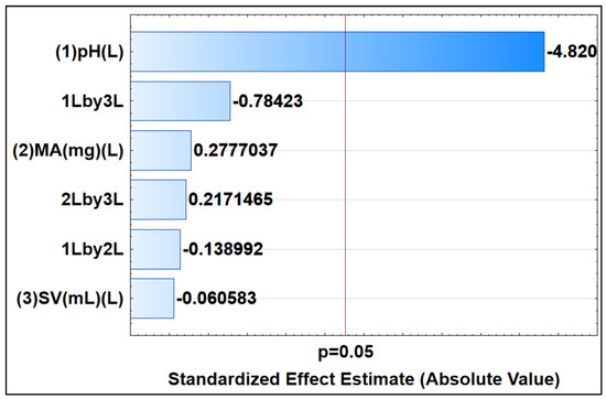 Response surface methodology (RSM), which is made possible by CCD, was used to investigate the impact of significant parameters, including the MA, SV, and sample pH, in order to remove DCF from the aqueous solution. The Pareto chart in Figure 9 depicts the outcomes. Information about the importance of the variables and how they interact is provided by the horizontal bars. If the horizontal bar passes the red line (95 % confidence level), it indicates that there is statistical significance for the factor or interactions [71]. Based on the Pareto chart (Figure 9), it is evident that the pH demonstrated statistical significance for the process of adsorptive removal. Additionally, the negative pH value (−4.820) suggests that sorption is highly favored at lower pH levels.
