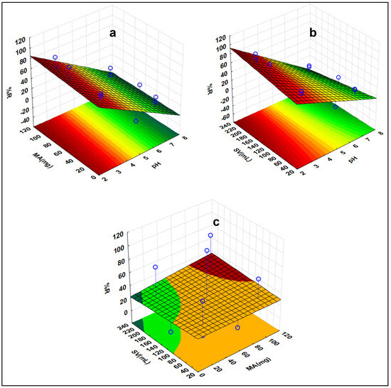 Response surface methodology of DCF indicating the interactive effects of the investigated factors (a) MA vs. pH, (b) pH vs. SV, and (c) MA vs. SV.